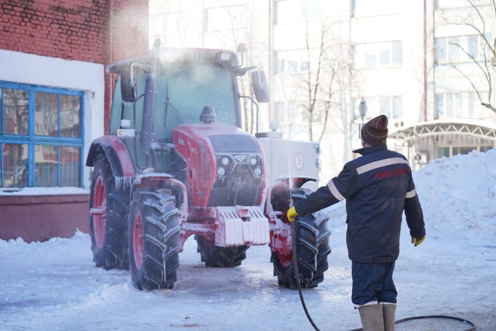 Pracownicy MTZ-a postanowili sprawdzili, czy ciągnik Belarus da się bez problemu uruchomić, gdy zostanie całkowicie zamrożony. Dlatego przy siarczystych mrozach minus 15-20 stopni C zaczęli oblewać traktor wodą, aby cały pokrył się grubą warstwą lodu.