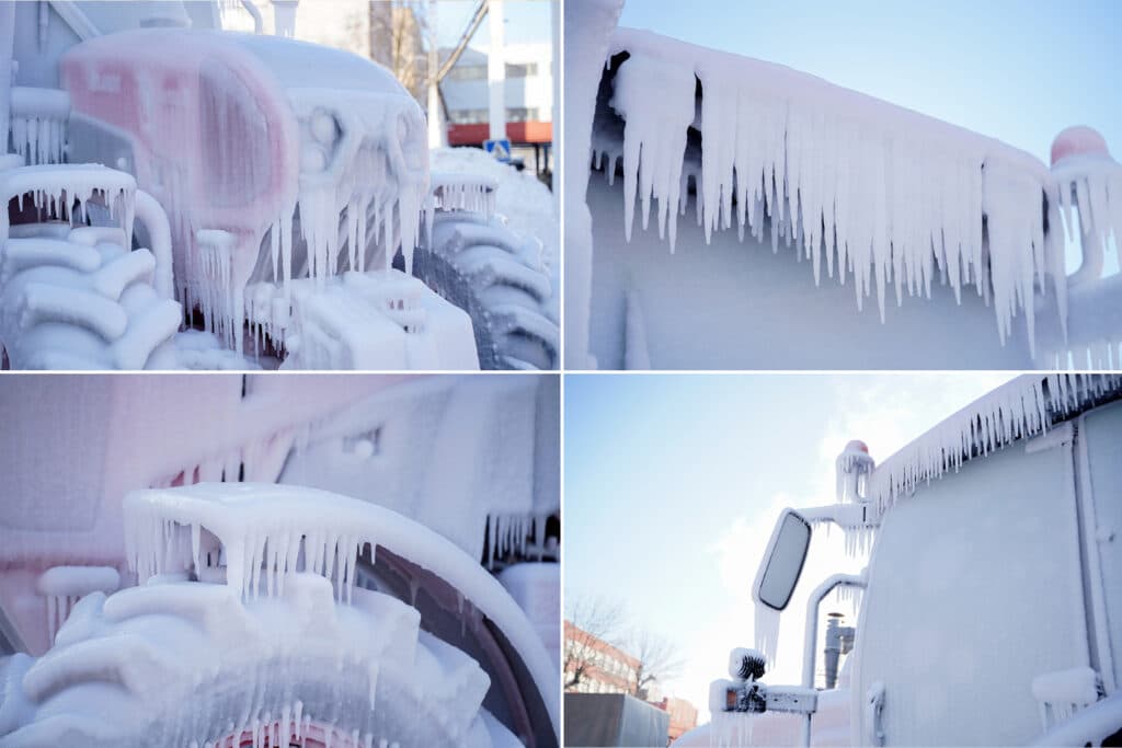 Następnie przyszedł moment próby. Pracownik, aby dostać się do kabiny musiał skuć część lodu. Po przekręceniu kluczyka motor uruchomił się – tak przynajmniej przedstawia film z tego testu, który firma MTZ opublikował na swoich mediach społecznościowych (link poniżej). Ile jest w tym prawdy, a ile propagandy? Czy coś było robione z akumulatorem? Tego nie wiemy. Wiadomo natomiast, że gdy mróz ściśnie do poziomu minus 18 stopni C, zasób energii w akumulatorze może spaść do 40 procent jego pojemności. A dodajemy jeszcze raz że ten traktor wedle zapewnień przestał na zewnątrz w arktycznych mrozach 3 dni.