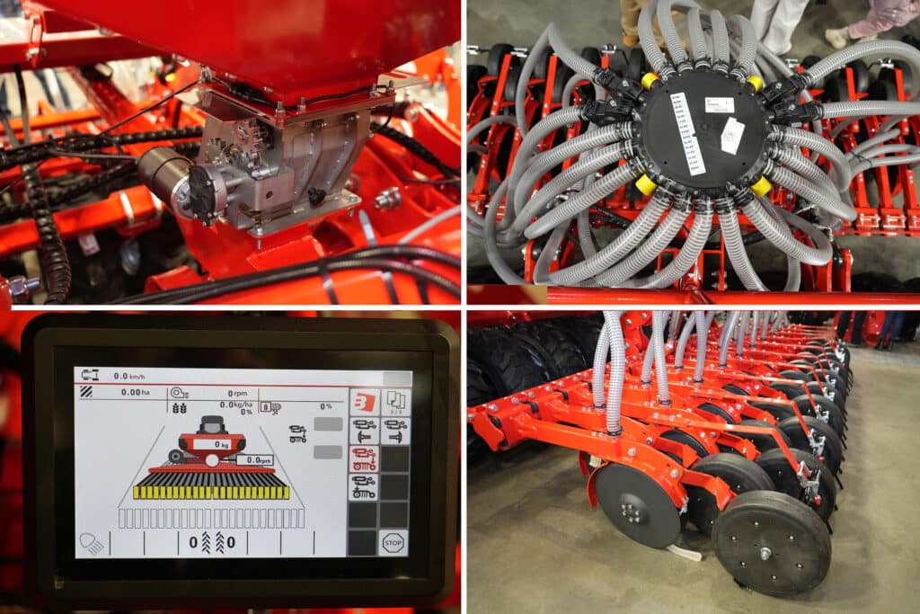 Zbiornik na ziarno ma 1050 litrów pojemności, co odpowiada ładowności ok. 800 kg pszenicy. U jego podstawy znajduje się napędzany elektrycznie aparat wysiewający. Wygarnia on nasiona ze zbiornika podając w strumień powietrzna wytworzony przez napędzany hydraulicznie wentylator. Rozdzielanie materiału siewnego do poszczególnych redlic odbywa się w głowicy, która jest umieszczona nad szyną siewną. Dozowanie nasion odbywa się według prędkości jazdy pobieranej z GPS. Takie rozwiązanie gwarantuje najwyższą precyzję wysiewu. W opcji będzie możliwe wyposażenie siewnika w czujniki przepływu nasion.