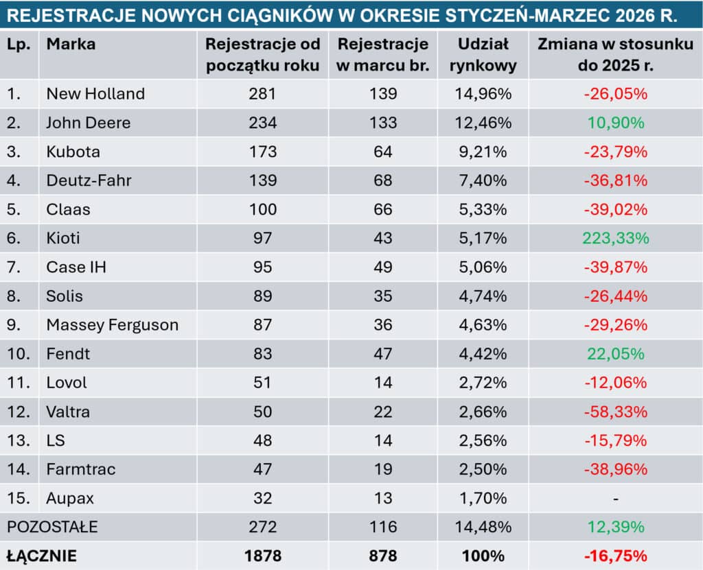 Coraz lepiej radzi sobie firma Claas, która zanotowała potężny awans z 11 na 5 miejsce. To zasługa m.in. tego, że ten producent w marcu wprowadził na rynek 37 traktorów o mocy ponad 200 KM, co dało mu drugie miejsce w takiej kategorii mocy. Najwięcej z tego było sześciocylindrowych modeli Axion 870 o mocy max. 295 KM. Będąc przy temacie mocy warto dodać, że obecnie średnia moc nowo rejestrowanego ciągnika w Polsce wynosi 119,4 KM. W analogicznym okresie 2025 roku średnia moc była wyższa i wyniosła 130,9 KM. Najmocniejsze traktory o średniej mocy 166 KM kupują rolnicy w województwie kujawsko-pomorskim. Na drugim miejscu w takim zestawieniu jest województwo wielkopolskie ze średnią mocą 162,4 KM, a podium uzupełnia województwo lubuskie, gdzie średnia moc zarejestrowanych ciągników wynosi 161,1 KM. Z kolei ciągniki o najniższej średniej mocy 82,8 KM rejestrowane są w województwie świętokrzyskim.