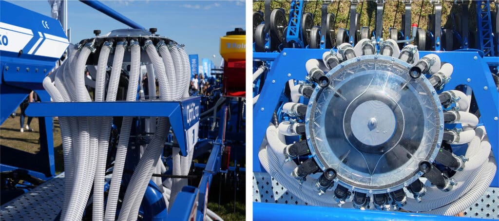 Na bronie nabudowany jest zbiornik o pojemności 1400 litrów. U jego podstawy zamocowany jest napędzany elektrycznie aparat wysiewający, który wygarnia nasiona ze zbiornika. Po rozdzieleniu strumień powietrza wytworzony przez wentylator przenosi materiał do głowicy rozdzielacza. Na koniec przewodami kierowany jest do poszczególnych redlic.