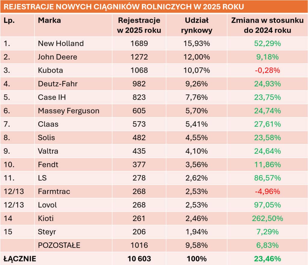 Zeszły rok był pokazem siły New Hollanda, który po rocznej przerwie powrócił na fotel lidera zestawienia rejestracji. Ten producent przez swoich dealerów osiągnął rok do roku ponad 50-procentowy wzrost sprzedaży. Druga lokata przypadła marce John Deere, zaś podium uzupełniła Kubota, której sprzedaż napędziły małe ciągniki o mocy do 50 KM.