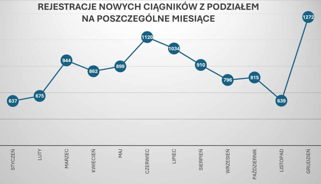 W zeszłym roku w naszym kraju zarejestrowano 10 603 nowe ciągniki rolnicze. I choć to więcej o 2015 sztuk (o 23,46 proc) od tego co trafiło na rynek w 2024 roku, to w drugim półroczu miał miejsce ostry zjazd w dół, wszak w tym okresie liczba rejestracji zmalała o ponad 40 procent, co może zwiastować jaki będzie ten rok. Co prawda w grudniu nastąpiło odbicie, ale wynik z tego miesiąca nie obrazuje prawdziwego oblicza rynku, wszak zawyżają go rejestracje wykonywane przez firmy „na siebie”.