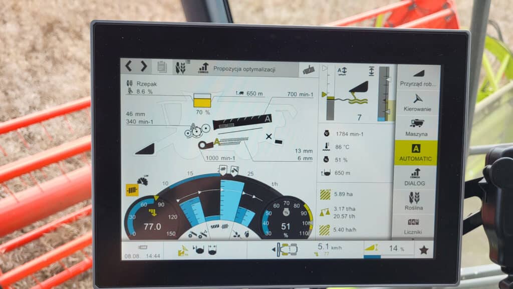 CEMOS AUTOMATIC ma wyręczać operatora kombajnu w konieczności monitorowania pracy poszczególnych podzespołów i dokonywania ustawień w trakcie pracy. W pełnej wersji system składa się z takich rozwiązań jak: AUTO HEADER regulujący w zespole żniwnym wysunięcie i wysokość ustawienia nagarniacza oraz wysunięcie stołu, AUTO THRESHING zmieniający obroty bębna młócącego, ustawienia szczeliny klepiska oraz listwy domłacającej, AUTO SEPARATION regulujący w kombajnach hybrydowych prędkość rotorów oraz ustawienia klap pod rotorami, AUTO CLEANING odpowiadający za otwarcie sita górnego i dolnego oraz ustawienie prędkości wentylatora, AUTO CHOPPING dostosowujący pracę siekacza poprzez hydrauliczną regulację przeciwostrzy, CRUISE PILOT regulujący prędkość kombajnu, AUTO CROP FLOW wykrywający skoki obciążenia i zapobiegający przeciążeniom. Maszyna, którą testowaliśmy została wyposażona w automatyczne sterowany układ młócenia, separacji i czyszczenia. Sama regulowała także prędkość jazdy oraz wykrywała skoki obciążenia.
