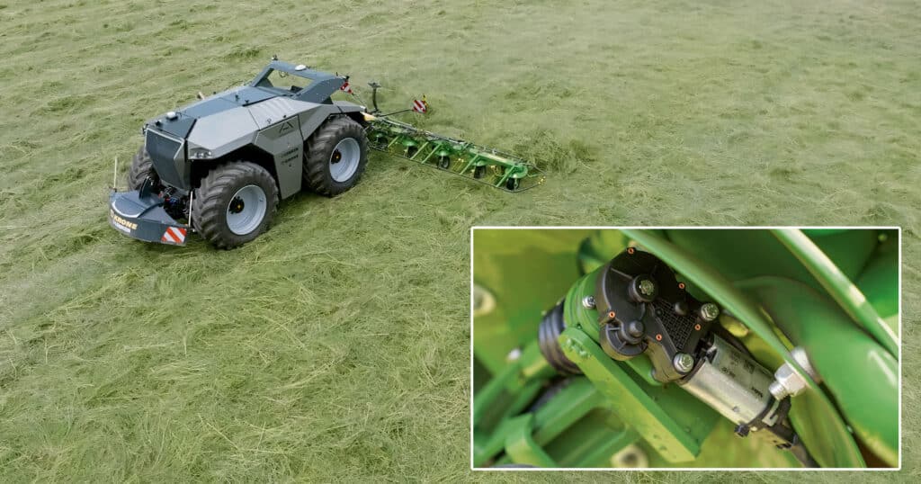 19. Elektryczna regulacja kąta ustawienia wirników przetrząsaczy karuzelowych (Krone)