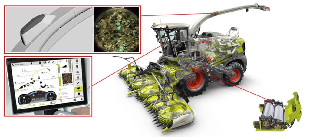 Przy zbiorze kukurydzy na kiszonkę warto określić wskaźnik CSPS (Corn Silage Processing Score) informujący o stopniu kondycjonowania ziarna, ponieważ na podstawie tego parametru można prawidłowo ustawić zgniatacza ziarna. Do tej pory CSPS był ustalany w laboratorium. W przypadku firmy Claas ocena tego parametru wymagała użycia smartfona i systemu Claas Connect. Najpierw pobierana była próbka sieczki, którą potem rozprowadzało się jako pojedyncze próbki na należącej do zestawu tacy. Następnie próbki były fotografowane smartfonem i wysyłane do analizy. Wynik był przesyłany do smartfona w ciągu kilku minut. Claas poszedł o krok dalej i opracował system Cemos Auto Chopping, dzięki któremu wartość CSPS jest określa na polu i to bez jakichkolwiek dodatkowych zadań i czynności. Podstawę systemu stanowi zainstalowana na rurze wyrzutowej sieczkarni kamera. Wykonane przez nią zdjęcia sieczki są analizowane za pomocą sztucznej inteligencji i na tej podstawie określany jest aktualny stopień rozdrobnienia ziarna. Podczas badania najpierw rozróżniane jest ziarno od pozostałych części roślin, by następnie zmierzyć wszystkie części ziarna. Operator jest informowany wskazaniem na wyświetlaczu o aktualnej wartości CSPS.