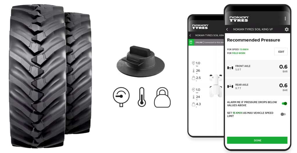Bardzo ważny w przypadku pracy ciągników rolniczych jest wybór odpowiedniego ciśnienia w oponach. Ma on bowiem wpływ na zagęszczanie gleby i zwiększenia trakcji na polu. Ma przełożenie również na opory toczenia na drodze. Jednym z czynników decydujących o wyborze odpowiedniego ciśnienia w oponach jest masa traktora. Do tej pory wymagane było zważenia ciągnika wraz z osprzętem. Nokian Tyres opracował dla opon Soil King VF system Intuitu 2.0 Smart Pressure Assistant, który podaje zalecenie ciśnienie opon do jazdy po drogach i po polu w zależności od obciążenia osi. Wykorzystuje on najnowszą generację czujników opon, dzięki którym obciążenie można określić podczas jazdy w zaledwie kilku minut. System uwzględnia prędkość jazdy, konfigurację ciągnika i stan podłoża, osiągając dokładność pomiaru obciążenia +/- 5 procent. Wartości te można następnie wykorzystać w centralnym systemie regulacji ciśnienia w oponach. W przypadku zmiany ciężaru urządzenia lub balastu, pomiar obciążenia można szybko i łatwo powtórzyć.