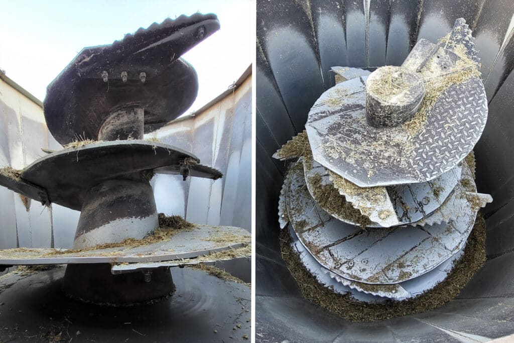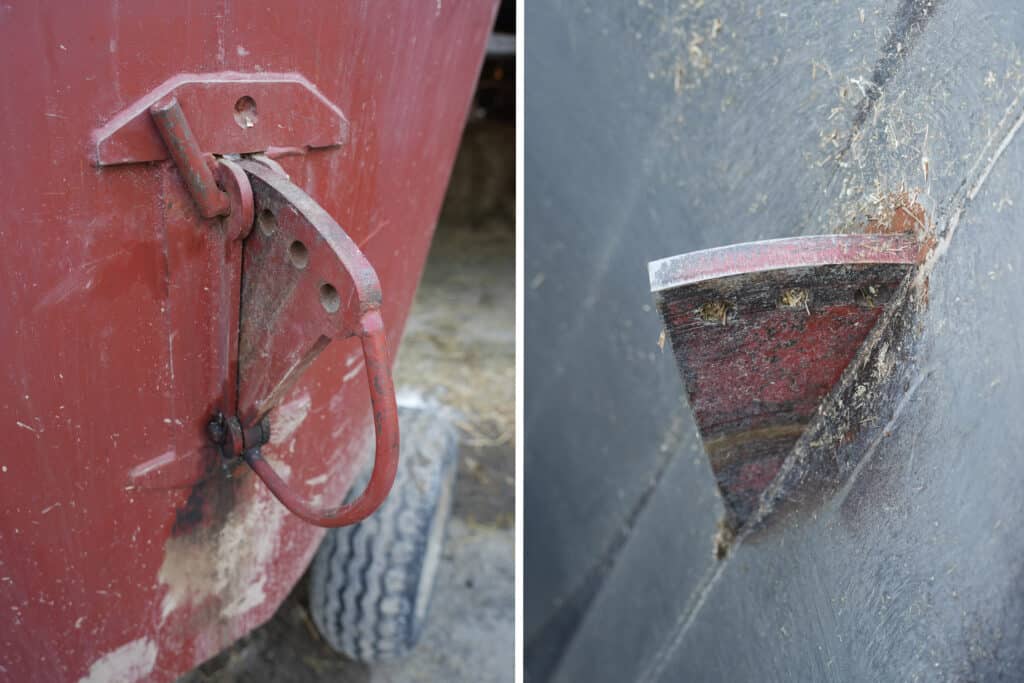 Zbiornik został posadowiony na trzech czujnikach, które są połączone do wyświetlacza wagowego. Dzięki temu wiadomo jaka jest masa ładowanych do zbiornika komponentów. A te obecnie stanowi: siano, słoma, sianokiszonka pobierana z pryzmy, kiszonka z kukurydzy i CCM. Do maszyny dołożony został podest pozwalający na kontrolowanie mieszania paszy, a w ścianie zbiornika zamontowano regulowany ręcznie przeciwnóż, który ma aż siedem pozycji ustawienia. Zwieńczeniem prac było wycięcie w tylnej części zbiornika szerokiego na ponad pół metra okna wysypowego i zamocowanie przy nim unoszonej hydraulicznie zasuwy.