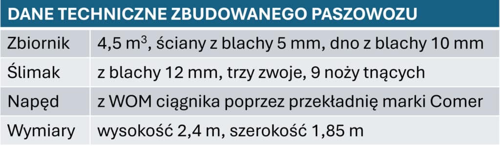 – Łączny koszt zbudowania paszowozu, nie licząc własnej robocizny, wyniósł około 10 tys. zł. Ten koszt podbiło to, że przy budowie wykorzystałem wiele fabrycznie nowych elementów takich jak blachy, noże czy przewody hydrauliczne – opisuje Paweł Krupnik.