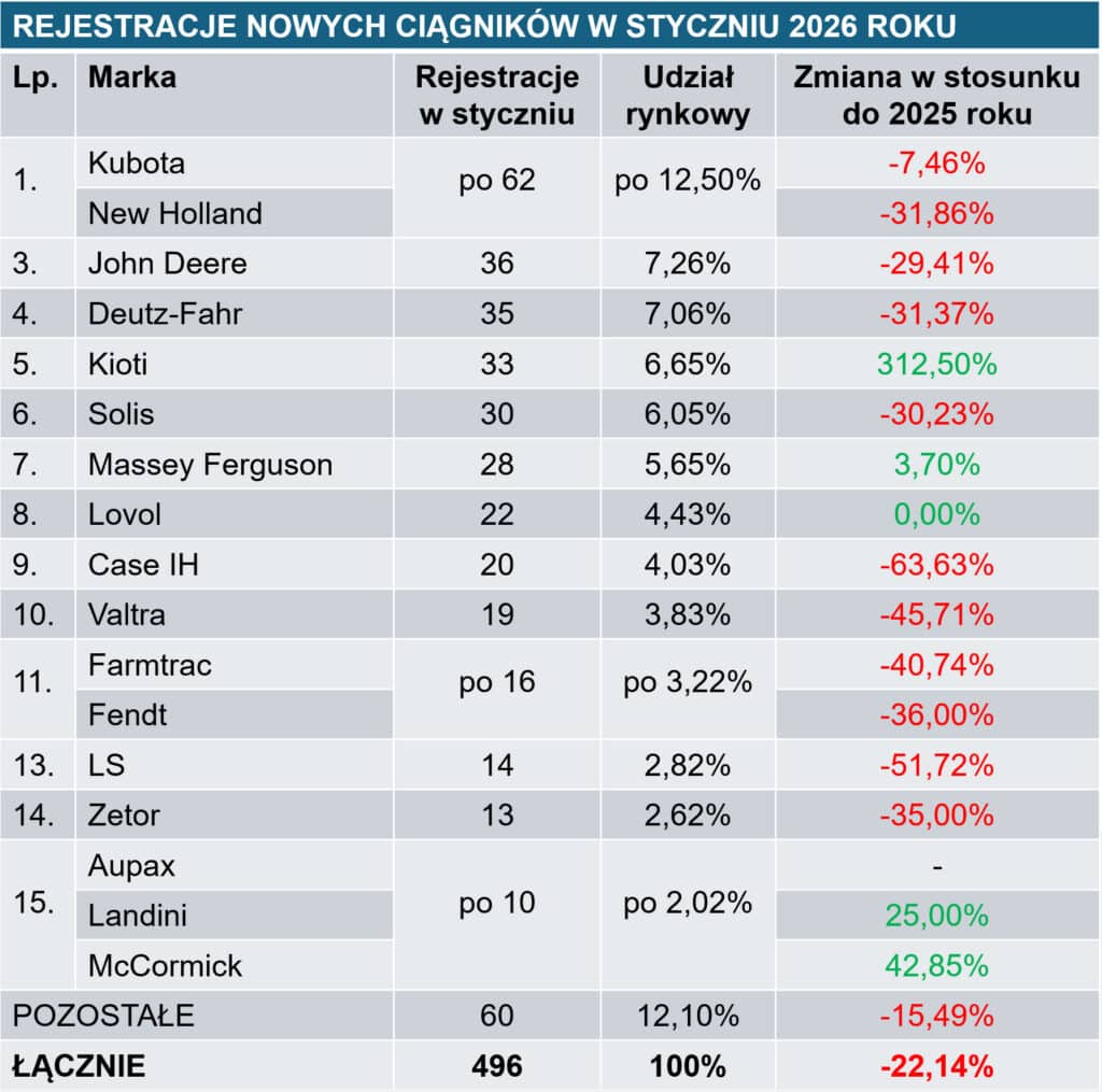 W ubiegłym miesiącu liczba rejestracji fabrycznie nowych ciągników spadła o 22 proc. względem analogicznego okresu roku 2025. Ale nie wszystkie marki zaliczyły spadki. Koreański Kioti dzięki wprowadzeniu na rynek 33 traktorów znalazł się na bardzo wysokim piątym miejscu zestawienia. Dla porównania w styczniu 2025 roku ten producent z liczbą 8 rejestracji plasował się dopiero na 17 miejscu. Ambicie koreańskiego producenta są jeszcze większe, bo chce awansować do top 3 zestawienia. Na razie musi ustąpić pola liderom rynku, którymi są firmy New Holland, Kubota oraz John Deere. Kolejnym zaskoczeniem styczniowej rejestracji jest słaby wynik firmy Case IH, która na koniec stycznia 2025 roku dzięki zarejestrowaniu 55 traktorów była na najniższym stopniu podium. Z kolei w styczniu 2026 r. wprowadzając na rynek 20 maszyn ulokowała się dopiero na 9 miejscu notując ponad 63 proc. spadek sprzedaży.